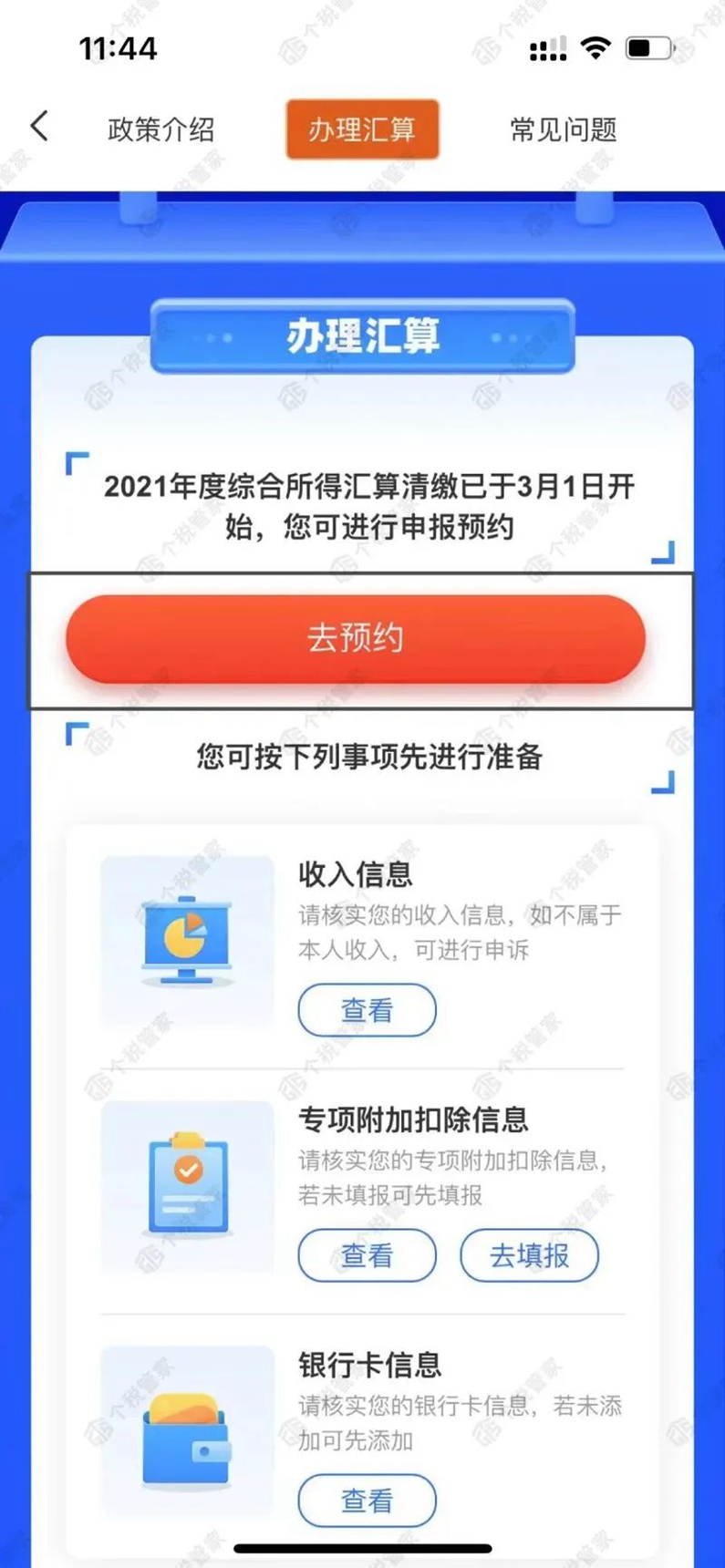 登錄個稅APP首頁,選擇【2021綜合所得年度匯算】--【去預(yù)約】。