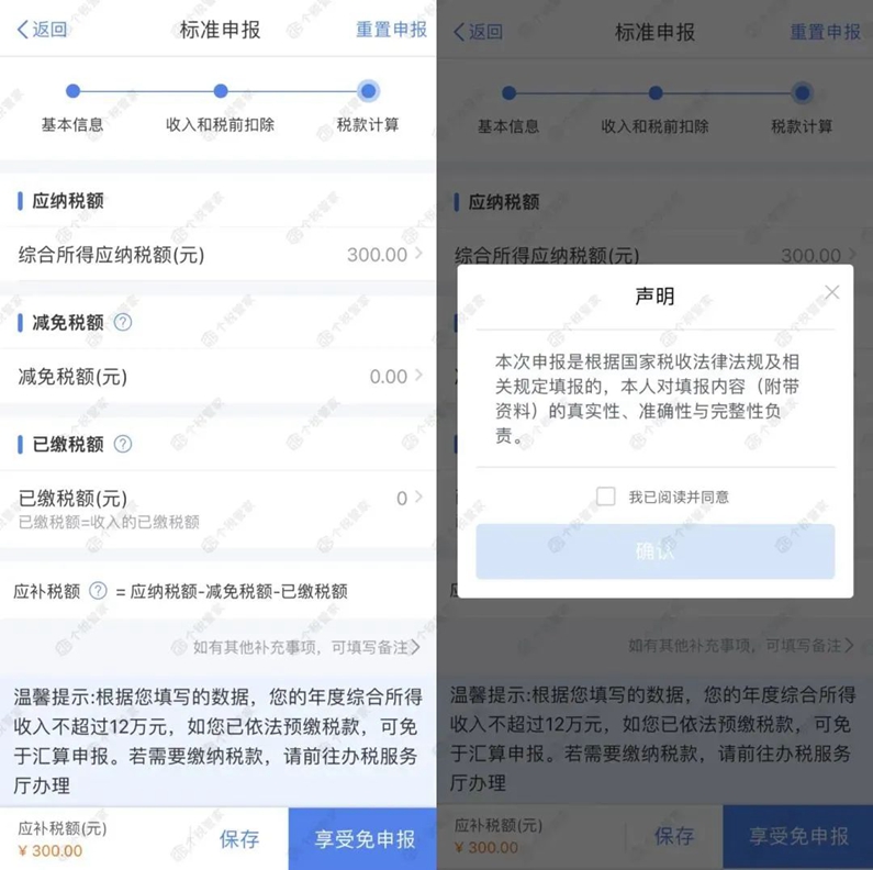 7.如果在標準申報頁面,提示有應(yīng)補稅額,在年收入不足12萬元或者補稅金額≤400元的情況下,可以點【享受免申報】。