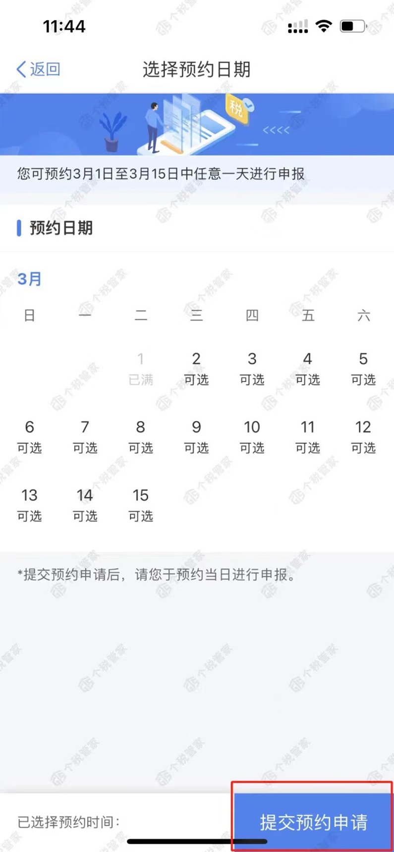 2.選擇日期,提交預(yù)約申請,即可預(yù)約成功。