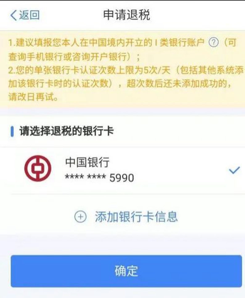 6.最后選“下一步”--“申請退稅”--“確定”--“選擇銀行卡”--“完成”。